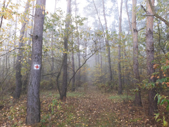 A látási viszonyok a tegnap estéről már ismert buszfordulóban sem voltak sokkal jobbak..és így nappali fénynél kiderült, hogy még szemetesebb mint gondoltam. Ugyanúgy a piros kereszt jelzésen tértem vissza az elágazásba mint amin tegnap elhagytam azt, de legalább láttam is valamit, még ha messzire nagyon nem is. A köddel egyébként nincs nagy bajom, szerintem egyfajta misztikus hangulatot varázsol az erdőbe, más a helyzet a hegyvidéken túrázom és a panorámából csak az orrom hegyéig látok.